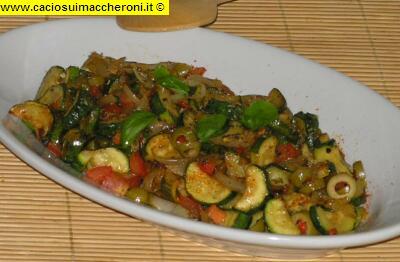 4 zucchine, 1 cipolla, 4 pomodori freschi, 1 cucchiaio di capperi, 1 etto di olive verdi farcite, origano, un mazzetto di basilico fresco, sale, 4 cucchiai di olio.